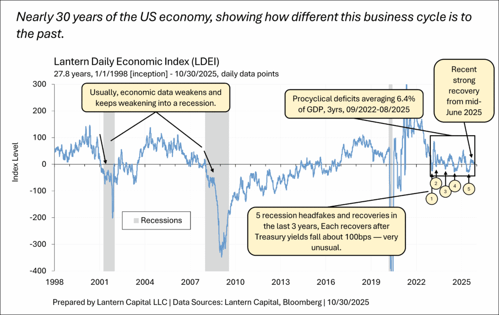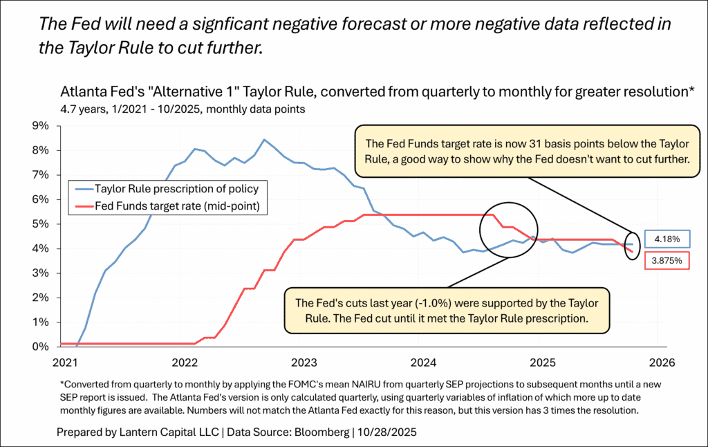 2. But, towards the end of the press conference, Powell slipped up amid answering a question about if dissenting votes make it harder to do his job suggesting that not only does he already perceive the December meeting as a pause (i.e., not just uncertainty), he doesn’t know if/when they will start cutting again. This is a hint of him seeing the pattern of economic waves in this cycle I’ve identified, suggesting it will be a while before cutting is on the table again. Turning the whole committee around to this point took a while and it will presumably take a while to reverse course again. The only ardent doves on the committee that I see are Stephen Miran and Michelle Bowman; both with presumed political motivations. It will be interesting to see if any others make themselves known in upcoming Fed speak. I include more of the quote for surrounding context, but the bolding is the important part.