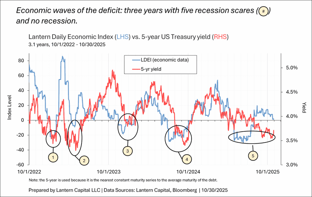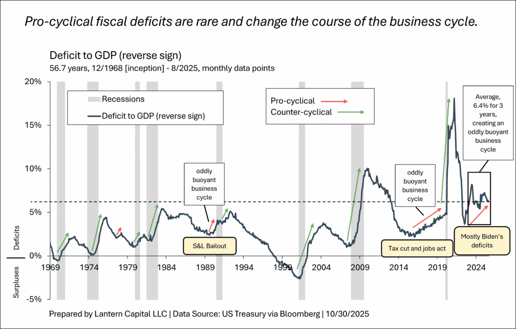 Yesterday’s FOMC meeting was a meaningful pivot that I suspect will result in significantly higher Treasury yields (particularly at the front-end/belly of the curve) over time to price-out the cutting that has been priced in, not unlike the end of last year. For a fifth time in this cycle, the bond market priced in the beginnings of a recession, but because the economy is so buoyant, likely from the large fiscal deficit (three charts below), it rebounded since data released in mid-June which eventually led to this pivot (after a detour through a labor market scare).
