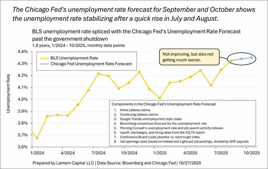 At the same time, I am waiting to see layoffs trending higher, economic data trending lower (LDEI), and corporate markets broadly weak (corporate bond spreads, equities, loan availability) to know something has materially changed from the pattern of the last three years. Despite my expectation for that happening early next year, as soon as it happens, I will see that as a big change in the economy.