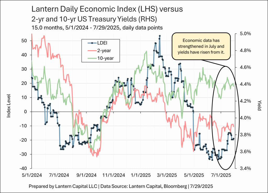 3. Tariff levels are becoming more settled; inflation is still not running away. Most of the largest US trading partners have made trade deals and settled on a tariff rate for exports into the United States, including the biggest, the EU, at 15% this week. The Fed is very interested in where the effective tariff rate (ETR) will land to model what it’s inflation impact will be. The ETR appears to be settling somewhere in between 15% and 20% (18.2% as of yesterday from the Budget Lab at Yale). Each trade deal removes more uncertainty. From Waller’s simple tariff inflation model, an 18.2% effective tariff rate, with consumers absorbing one-third of that price increase, and 10% of consumer spending on foreign goods, results in a one-time tariff price increase of 0.6% (.182 * .033 * .1); not the end of the world.