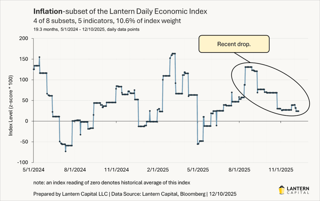 I think that Powell is too sanguine about future inflation given that 60% of the CPI (core services, presumably not from tariffs) has risen 3.9% annualized over the last three months, but the inflation component of the LDEI has fallen since late August (the main driver of why the LDEI has fallen over the last 2-3 months) and so it isn’t surprising to see Powell reflect this as well (chart below).