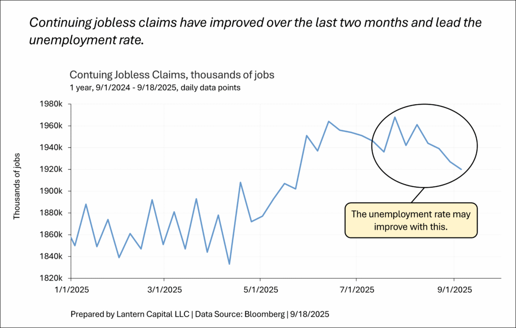 Today’s jobless claims report is a hint that it could. Last Thursday showed a large spike upwards in initial jobless claims which, along with lower payrolls and the unemployment rate up, helped solidify the story of an imminent recession for the doves. But that spike reversed this week. Initial claims fell 33k after rising 28k last week. Continuing jobless claims, which lead the unemployment rate, have been improving for nearly two months suggesting the unemployment rate may improve. More broadly, because overall economic data are rising, I expect them to eventually influence the labor market positively too.