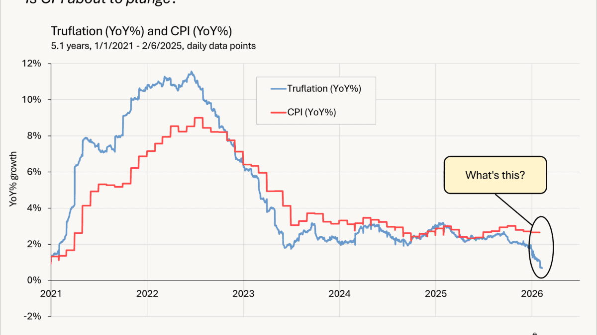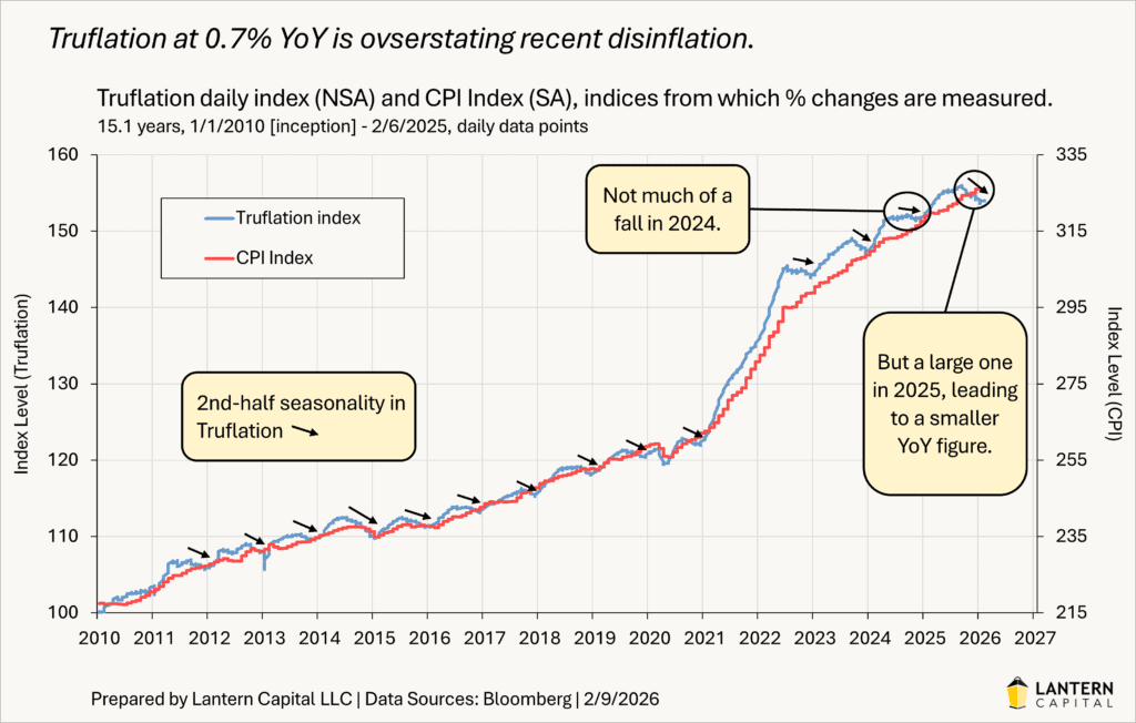 Unlike the CPI, Truflation isn’t seasonally adjusted. Theoretically, measuring a year-over year figure should nullify consistent seasonal effects, but they’ve been inconsistent over the last two years. The Truflation index has a consistent pattern of falling in the second half of the year from seasonality. You can see this in the black arrows in the chart below. Those second-half drawdowns vary somewhat over time, but average -0.8%. In 2024, there wasn’t much of a seasonal effect (-0.2%) versus a large one in 2025 (-1.0%). This discrepancy is creating a high base effect for Truflation’s YoY figure and lowering it. There is no way to precisely pinpoint the amount of the effect given all the moving parts, but Truflation is overstating disinflation.