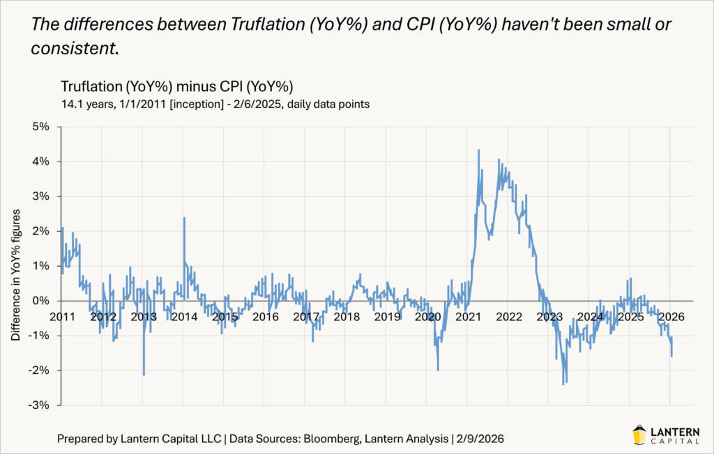 Truflation is a newer private real-time statistic of inflation that comes out each day (similar to the LDEI) with more granularity to see trends changing faster, be more timely, and fill-in when official data is absent (like last year’s government shutdown). Since its inception in 2010, the Truflation index (YoY%) has a correlation coefficient to the YoY headline CPI index of +0.92. While +0.92 is close to perfect, this figure still allows for large deviations from the CPI. The chart below shows the subtraction of Truflation (YoY%) minus CPI (YoY%), showing that the 0.92 correlation coefficient isn’t as locked together as one might expect. It is important to note that whenever Jerome Powell was asked about private-sector alternative data during the recent government shutdown, he never mentioned Truflation, in fact he never mentioned any name of a good inflation substitute. Truflation is materially different than the CPI because CPI uses surveys, observed prices, and imputations where things are missing, Truflation is purely observed prices from only digital transactions; credit cards, online prices, and private data feeds. CPI is a broader picture of inflation.