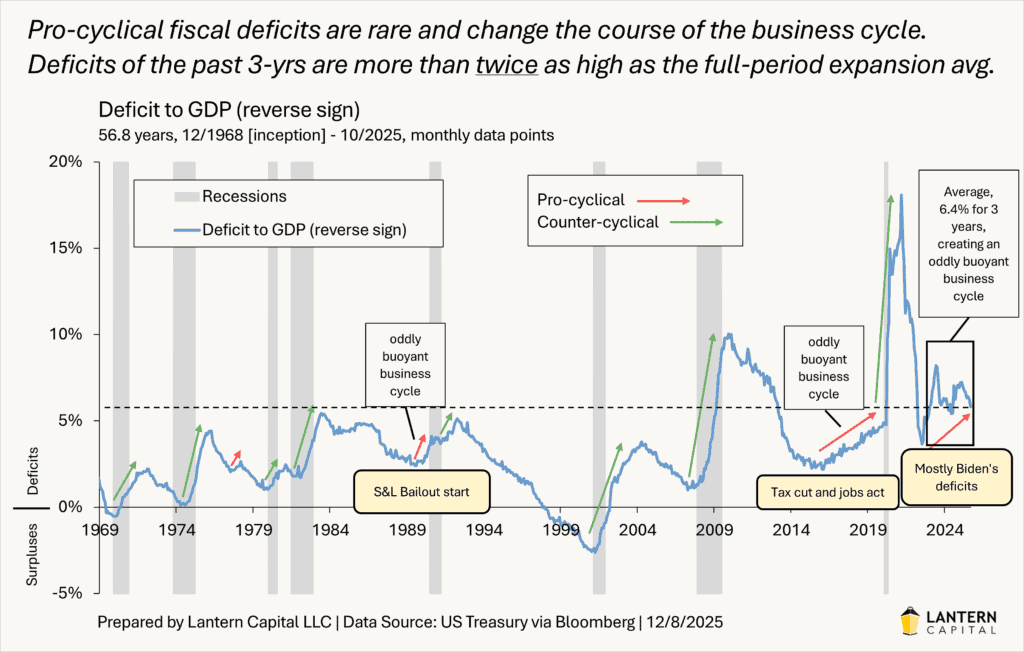 Fiscal deficits keep the economy more buoyant than would otherwise be the case and are the most logical reason why the economy has remained in a state of purgatory at the top of this business cycle. The deficit is important to re-acknowledge because of how massive it is (biggest pro-cyclical deficit since WWII), how long it has been this way in an expansion (three years), and because it isn’t going away. It is expected to remain around 6% of GDP in 2026 with several fiscal elements of the One Big Beautiful Bill Act taking effect in January.