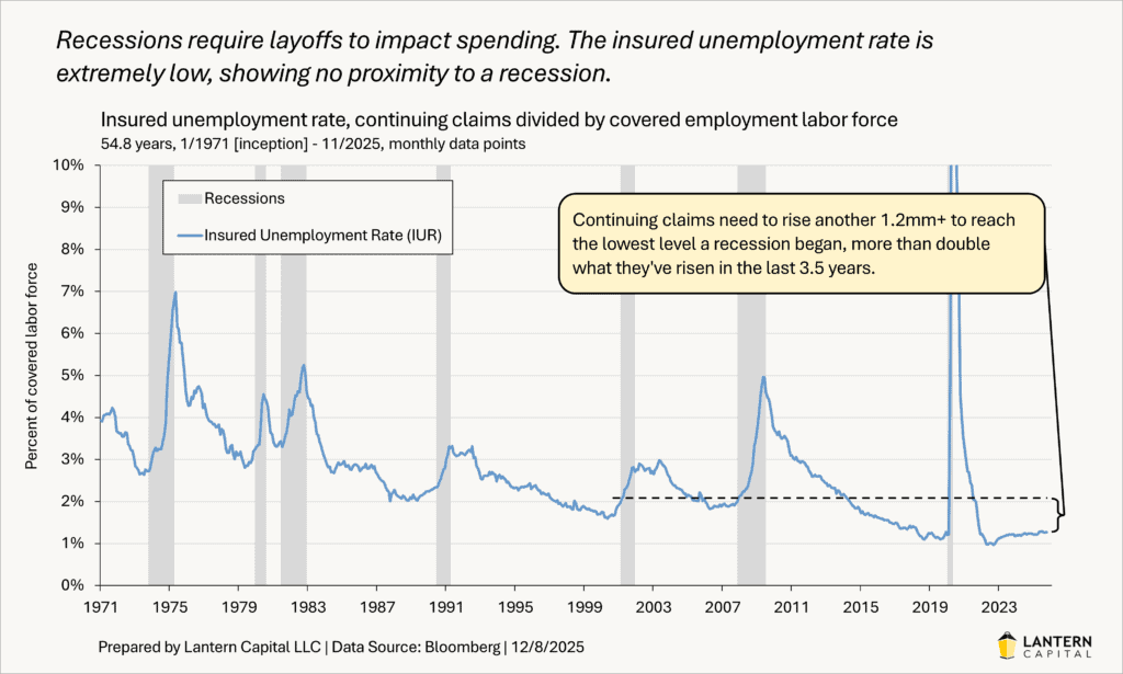 Mass layoffs are a crucial component to a recession because they directly impact consumer spending where low payroll growth doesn’t distinguish between firing and lack of hiring; the latter of which doesn’t logically change spending. Usually, they go together, but not in this cycle. Layoffs are best seen through initial and continuing jobless claims; reliable series that go back to 1967. Continuing claims are well correlated to the unemployment rate with a lead and remain extremely low (chart below). For the insured unemployment rate (based on continuing claims) to rise to the lowest level where any past recession has begun (2001, ex. COVID-19), continuing jobless claims would need to rise another 1.2 million, more than double what they’ve risen over the last 3.5 years [12].