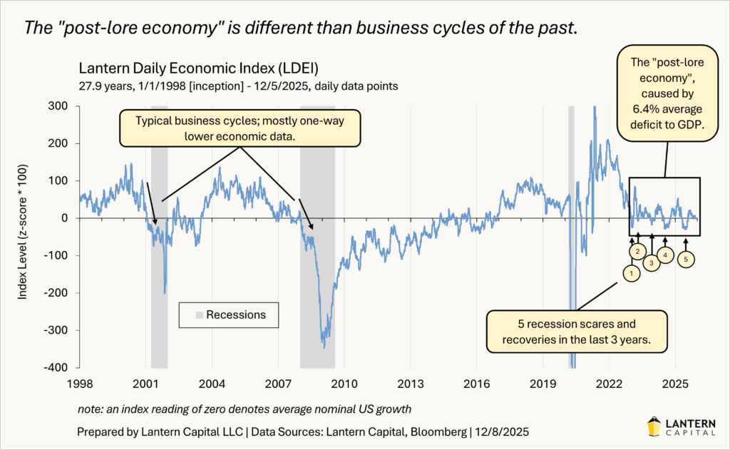 Deficits don’t create a continuously better economy. The business cycle still tries to poke through (like February to June this year and four times before that over the last three years), but every time Treasury yields have fallen about 100 basis points in a slump, the underlying economy is healthy enough such that these somewhat looser financial conditions are seemingly all it takes for the economy to recover. Then, as the economy improves, interest rates have risen about 100 basis points before tighter financial conditions constrict the economy enough that it weakens again, creating a stationary wave pattern correlated with interest rates for the last three years (chart below). While some of the inflection points (high and low) have idiosyncratic reasonings like the Fed’s Bank Term Funding Program (BTFP) in #2 or fading tariff uncertainty in #5, most don’t other than high or low Treasury yields.