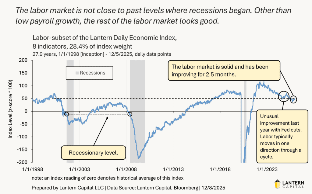 For three reasons, low payroll growth will become the fifth false alarm. First, by the LDEI or GDP expectations, the overall economy has already recovered from the wave of depressed economics in the spring and sustained it for four months [6]. In other words, to answer Jerome Powell’s quote above, the stronger growth we’re seeing is real. Consumer spending less inflation (69% of economy) rose 2.7% annualized in Q3 and Chicago Fed CARTS data suggests it has risen another 1.8% annualized through 2/3rds of Q4. Note: economists expect Q4 to be temporarily soft because of the government shutdown. Industrial indicators have risen since mid-June [7] and housing indicators have risen since late September [8]. The Beige Book, the Fed’s semi-quarterly report on anecdotal assessments of business activity, has shown an improving economy too with less of the economy in recession over the last three months [9]. The economy is doing well.