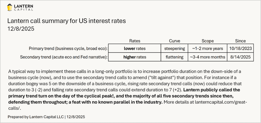 Because of the three-year deficit-suspended wave pattern and nothing to interrupt it, the economy having already recovered, and low stimulative Treasury yields, I expect this “post-lore economy” will continue with more solid economic growth, a labor market recovery like after the Fed cut rates last year, a paused Fed, and significantly higher Treasury yields. Barring event risk, the economy will only turn back around again negatively once Treasury yields have risen enough to restrict it. To summarize Lantern’s U.S. Treasury yield call: