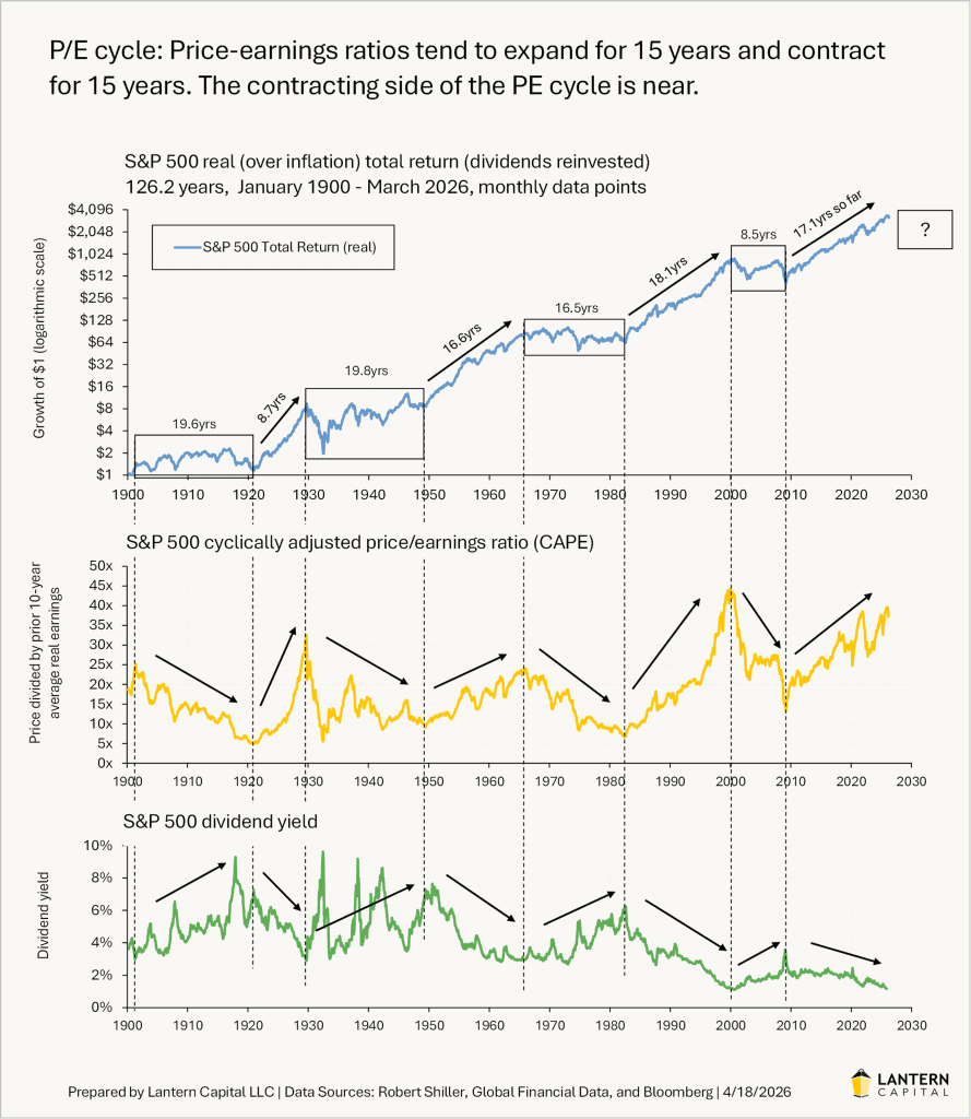 The chart below shows 126 years of S&P 500 real total returns (over inflation, dividends reinvested) on top, with the CAPE price-to-earnings ratio in the middle and the dividend yield on the bottom. Returns are shown in real terms because nominal returns mask the 1966-1982 period, where inflation created the illusion of progress while investors went nowhere for 16 years.