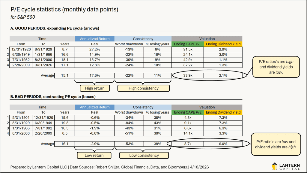 The pattern is striking. The market alternates between long periods of expansion (arrows) where prices rise steeply and consistently, and long periods of contraction (boxes) where prices go sideways with violent swings in between. These aren’t random. They are driven by the PE ratio trending in one direction for roughly 15 years, then reversing. The CAPE ratio and dividend yield are mirror images of each other: when investors are on the magic carpet ride up, they don’t think about dividends. When prices aren’t rising, dividends become a major reason to own stocks.